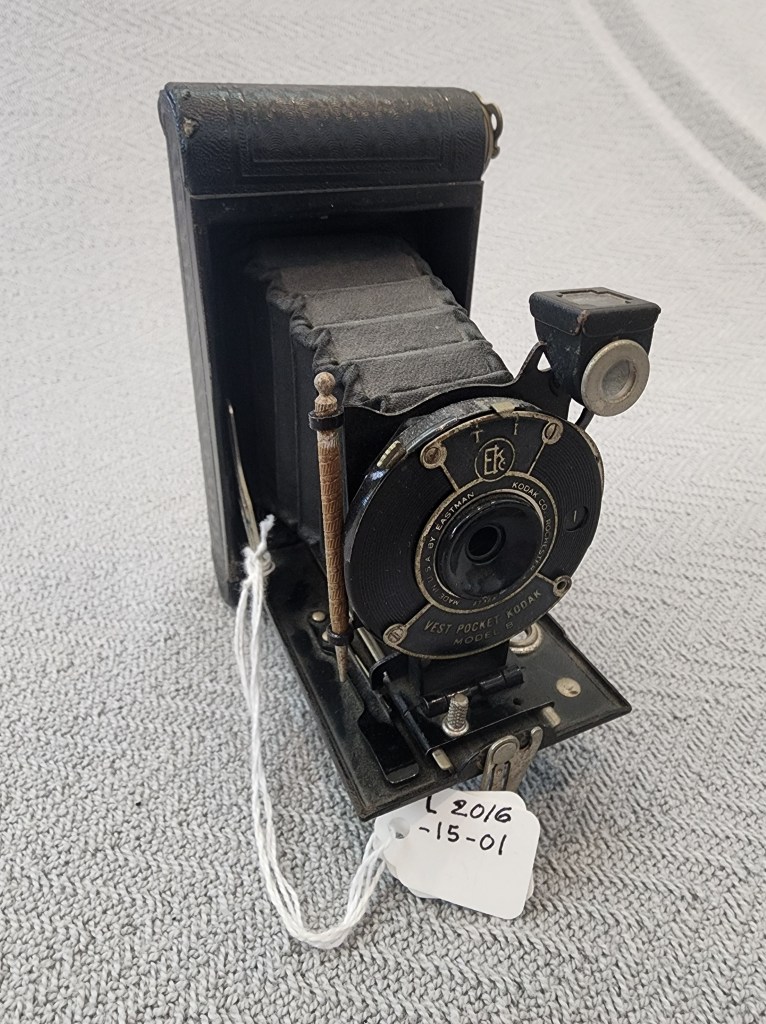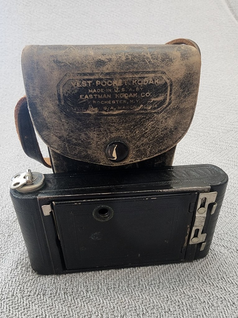 | The Kodak Vest Pocket Kodak Model B was released in 1925 as a compact, folding camera for 127 film, featuring a new design with a drop-down bed and circular front lens standard. Priced at $7.50, it was produced between 1925 and 1934 and featured a Meniscus Achromatic lens, a simple shutter (I/T), and autographic capabilities, making it a popular, portable choice for photographers. Key details regarding the Vest Pocket Kodak Model B (1925): Design & Features: Unlike earlier models, the Model B used a folding bed design. It was known for its compact nature, often described as fitting into a vest pocket, with a black leather-wrapped metal body. Film & Lens: It utilized 127 roll film to produce 8 exposures of approximately 6 cm x 4 cm, or (2.36\text{\ in}) by (1.57\text{\ in}). The lens was a simple Meniscus Achromatic with two aperture settings, roughly f/11 and f/16. Operation: The camera featured a “”T/I”” (Time/Instantaneous) shutter, with apertures adjusted by a thumbwheel numbered 1–4. It was an autographic camera, allowing users to write notes on the film’s backing paper. Variations & Legacy: The Model B was sold in several colors and versions, including models for the Boy Scouts and Girl Scouts, and later served as the basis for the colorful Kodak Petite (1929–33). It was designed for portability, with a focus on ease of use for the amateur photographer. “ |