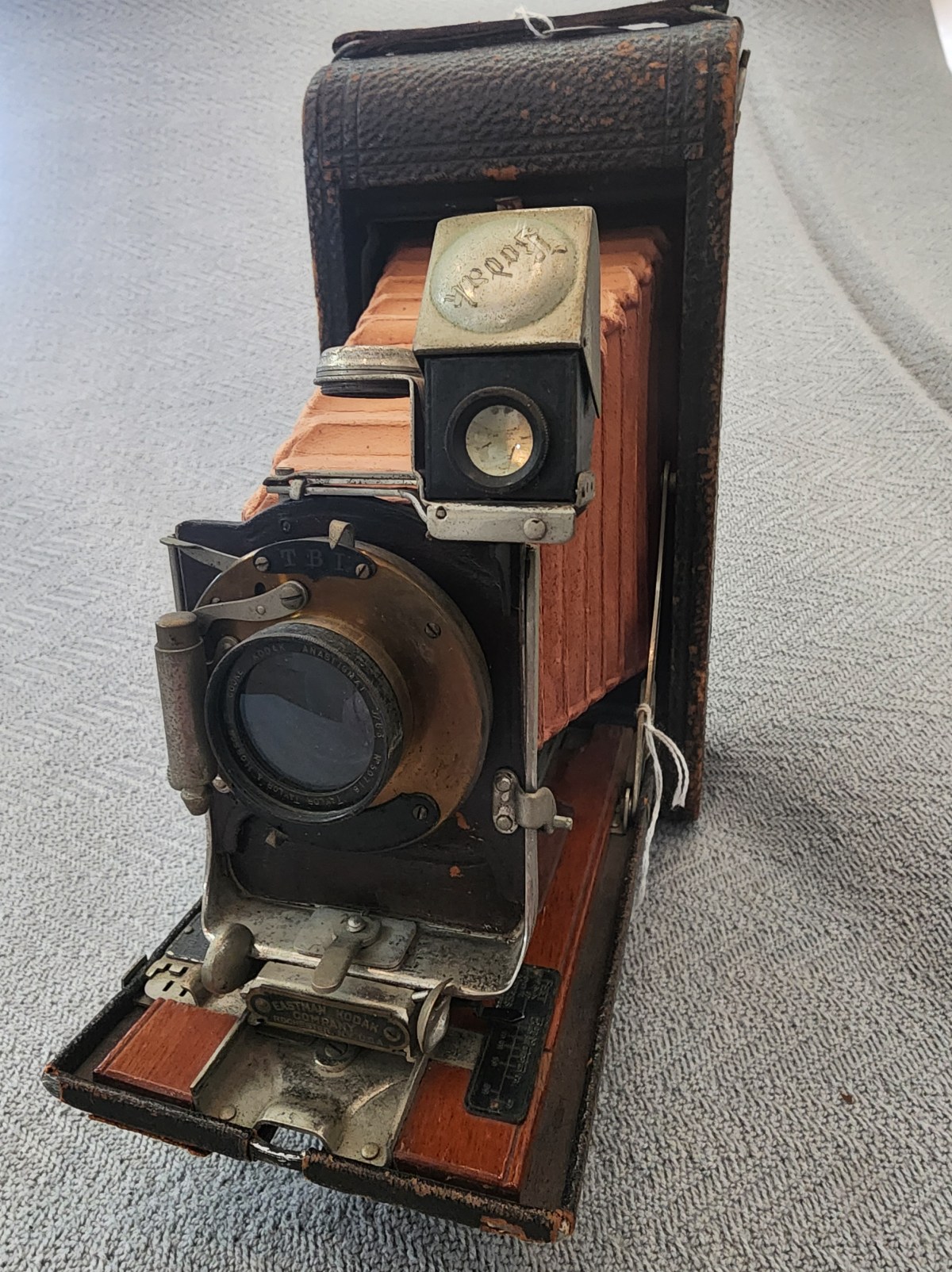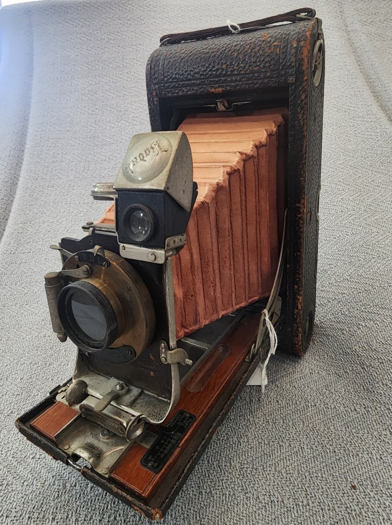 The Kodak 3A Model B-2 Folding Pocket camera is a vintage postcard-format folding camera manufactured by Eastman Kodak Co. between 1904 and 1906. It features a wood-bodied, leather-covered construction, producing 3¼”” x 5½”” (postcard size) exposures on #122 roll film. It is known for its “”Rapid Rectilinear”” lenses and early ball-bearing shutters.