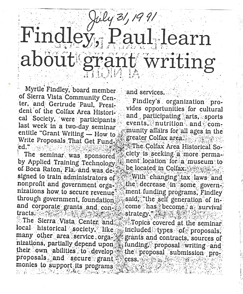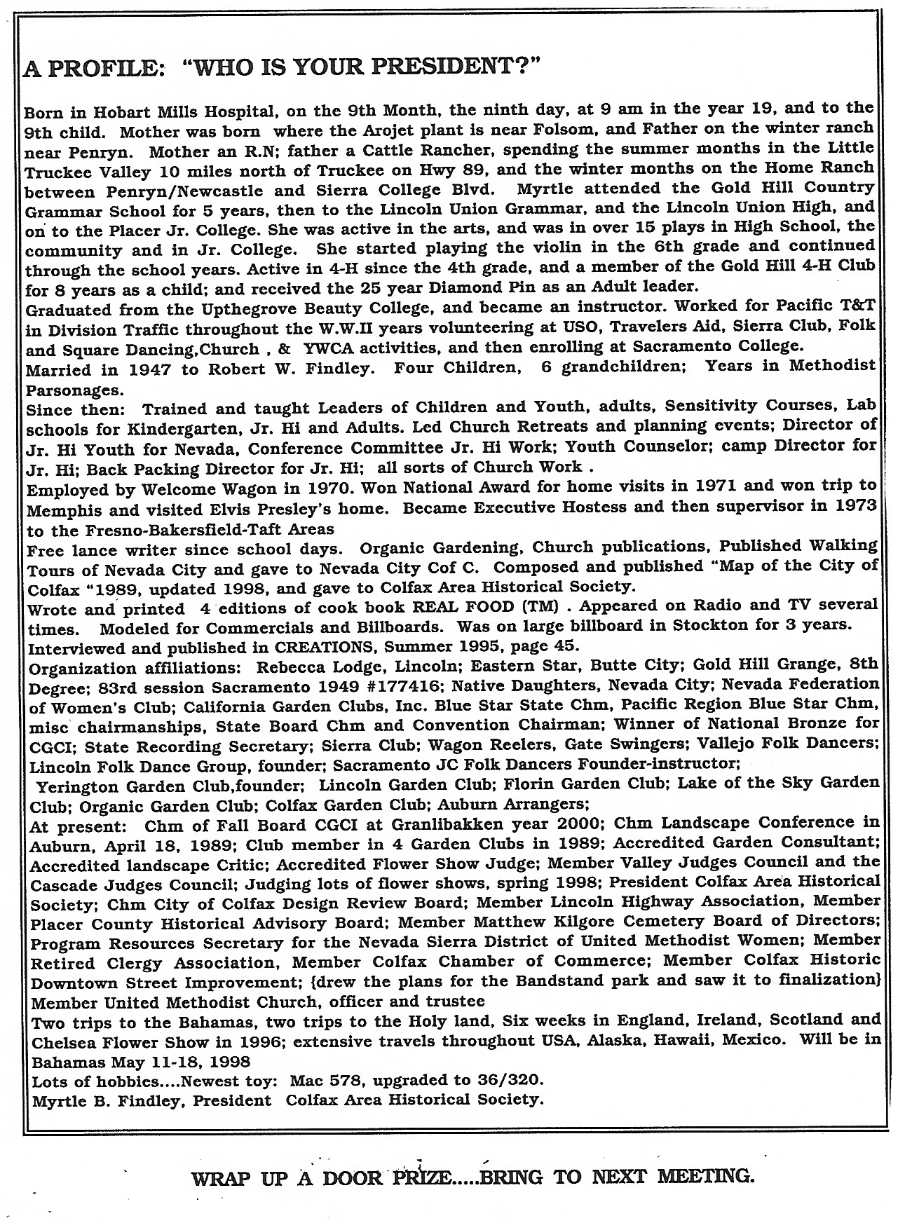 She was a member, officer, and trustee of the United Methodist Church. In 2001, the City of Colfax appointed a Depot Project Management Committee, with two CAHS members serving. Jim Wood was Chairman, and Myrtle Findley was vice chairman. The restored Passenger Depot is now the site of the Colfax Heritage Museum.