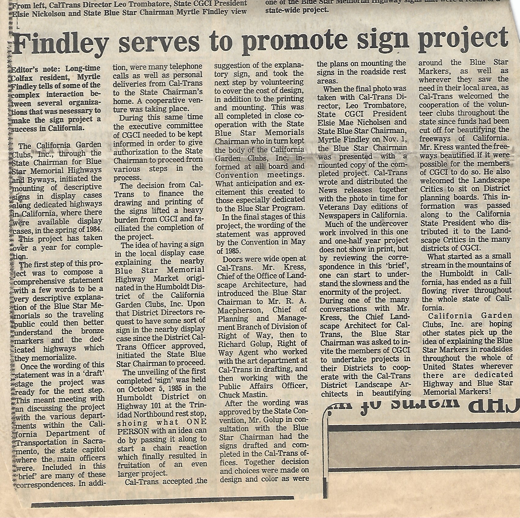 For decades Myrtle served throughout the community. She was involved with the beautification of downtown Colfax, served on the city’s Design Review Board, was chair of the Colfax Garden Club, and was a landscape and design consultant for the Garden Clubs of America.