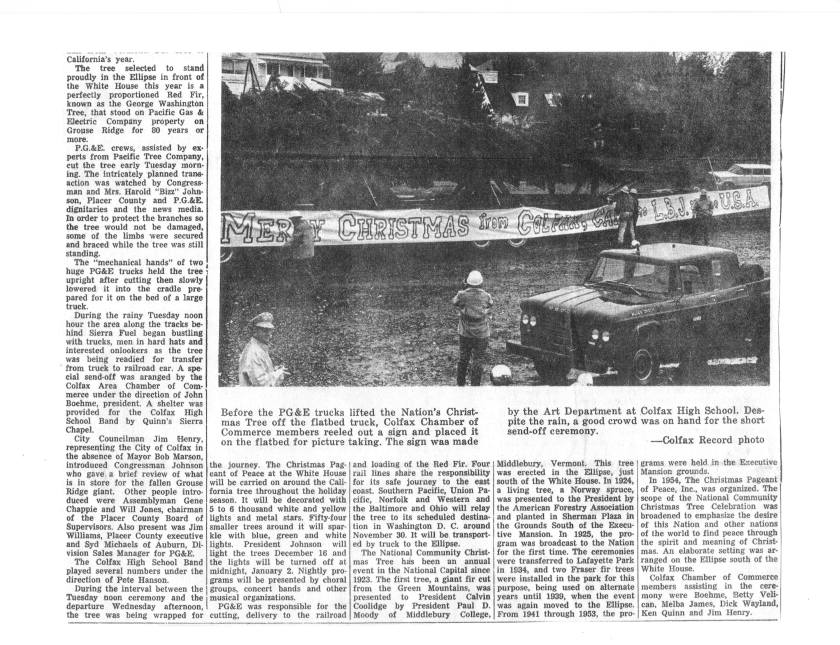 On November 17, 1966 the front page story in the Colfax Record was about the Christmas tree that had been shipped by rail from Colfax, California, to Washington, D.C., the previous day.